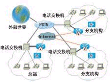 目前,大多數(shù)大型企業(yè)與分支機(jī)構(gòu)的電話和計算機(jī)網(wǎng)絡(luò)是相互獨(dú)立的,分處各地的辦公機(jī)構(gòu)建有局域網(wǎng),局域網(wǎng)之間通過Internet或企業(yè)專網(wǎng)互連,企業(yè)的數(shù)據(jù)業(yè)務(wù)通過計算機(jī)網(wǎng)絡(luò)傳輸。而各辦公機(jī)構(gòu)的電話網(wǎng)則采用傳統(tǒng)的電話交換機(jī)或集團(tuán)電話,內(nèi)部員工之間相互是分機(jī)撥號,電話交換機(jī)接入電信電話公網(wǎng),與外部的語音交流需要通過本地電話網(wǎng)或長途電話網(wǎng)。