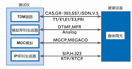 我們設(shè)計了一個呼叫測試。首先用被測設(shè)備搭建起一個完整的VoIP系統(tǒng),從模擬的語音開始,通過媒體網(wǎng)關(guān),再通過媒體網(wǎng)關(guān)控制器到另一個媒體網(wǎng)關(guān),最后從被叫方的一部模擬電話出來。