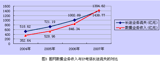 從圖2可知,固網(wǎng)運(yùn)營商數(shù)據(jù)業(yè)務(wù)收入2003年和2004年僅占總收入的10.65%和12.5%,數(shù)據(jù)業(yè)務(wù)年增幅達(dá)34.2%,數(shù)據(jù)業(yè)務(wù)收入增加值為89.87億元;同期,因IP電話分流造成的長途業(yè)務(wù)減收為146.06億元,可見在2004年數(shù)據(jù)業(yè)務(wù)的增長彌補(bǔ)不了IP電話分流造成的長途業(yè)務(wù)收入的流失。