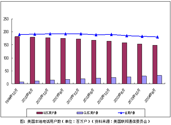 就整體而言,美國(guó)本地電話用戶(hù)總量穩(wěn)中有降,移動(dòng)通信的替代作用開(kāi)始顯現(xiàn)。截止到2004年6月,包括住宅和商業(yè)用戶(hù),美國(guó)本地電話用戶(hù)總量達(dá)到1.81億戶(hù)。但與3年前相比,美國(guó)本地電話用戶(hù)數(shù)量實(shí)際減少了近1200萬(wàn)戶(hù)。與此同時(shí),移動(dòng)用戶(hù)數(shù)量迅速增長(zhǎng)。截止到2004年6月,美國(guó)移動(dòng)電話用戶(hù)數(shù)比上年同期增長(zhǎng)13%,達(dá)到1.673億戶(hù),基本接近固定電話用戶(hù)的數(shù)量。