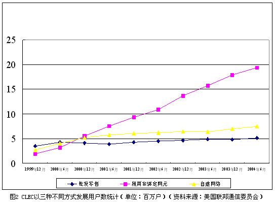 從經(jīng)營(yíng)模式上看,本地非主導(dǎo)運(yùn)營(yíng)商的商業(yè)模式在過(guò)去的5年中發(fā)生了很大變化。在市場(chǎng)剛剛開(kāi)始引入競(jìng)爭(zhēng)的1999年,42.9%的本地非主導(dǎo)運(yùn)營(yíng)商選擇了批發(fā)零售這種進(jìn)入門(mén)檻相對(duì)較低的商業(yè)模式,本地電話市場(chǎng)一度活躍著大量地區(qū)性的小運(yùn)營(yíng)商。由于面臨本地主導(dǎo)運(yùn)營(yíng)商的強(qiáng)烈抵制,非綁定網(wǎng)元政策的實(shí)施自公布以來(lái)一再推遲,經(jīng)過(guò)反復(fù)的法律訴訟,美國(guó)最高法院在2002年最終裁定非綁定網(wǎng)元政策合法。自那時(shí)起,AT&T、MCI等全國(guó)性的長(zhǎng)途電話運(yùn)營(yíng)商紛紛通過(guò)租用非綁定網(wǎng)元的方式進(jìn)入本地電話市場(chǎng)。截止到2004年6月,本地主導(dǎo)運(yùn)營(yíng)商已經(jīng)提供了約2150萬(wàn)線非綁定本地用戶(hù)線給本地非主導(dǎo)運(yùn)營(yíng)商。CLEC以三種方式發(fā)展用戶(hù)的情況如圖2所示。