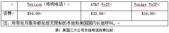 隨著寬帶接入的進(jìn)一步普及,VoIP似乎為打破本地環(huán)路的瓶頸提供了新的選擇,AT&T、Qwest、時(shí)代華納、Verizon等老牌運(yùn)營(yíng)商紛紛開(kāi)始提供這項(xiàng)服務(wù)。AT&T于2004年3月在新澤西州和德克薩斯州推出了29.99美元的包月計(jì)劃,其VoIP業(yè)務(wù)不僅包含了基本語(yǔ)音服務(wù),也提供諸如呼叫轉(zhuǎn)移、會(huì)議電話、來(lái)電顯示等增值服務(wù),美國(guó)三大公司本地電話資費(fèi)如表1所示。