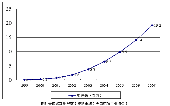 與此同時(shí),Qwest也開(kāi)始在明尼蘇達(dá)州提供類(lèi)似的VoIP業(yè)務(wù),并計(jì)劃在近期內(nèi)推向全國(guó)。Verizon與北電網(wǎng)絡(luò)簽訂了大筆的訂單,計(jì)劃全面改造其本地電話網(wǎng)絡(luò)提供的VoIP業(yè)務(wù)。一些曾經(jīng)著名的網(wǎng)絡(luò)電話公司(如Net2Phone)也開(kāi)始進(jìn)入傳統(tǒng)電話市場(chǎng)。截止到2004年2月底,Vonage的全I(xiàn)P網(wǎng)絡(luò)已經(jīng)擁有13萬(wàn)VoIP用戶(hù)。據(jù)美國(guó)電信工業(yè)協(xié)會(huì)預(yù)測(cè),到2007年年末,全美的VoIP用戶(hù)將會(huì)達(dá)到1920萬(wàn)戶(hù),如圖3所示。