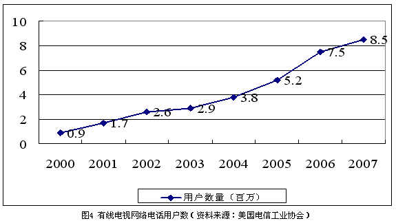 隨著有線電視用戶(hù)數(shù)量逐漸達(dá)到飽和,有線電視公司也在積極尋找新的利潤(rùn)增長(zhǎng)點(diǎn)。在過(guò)去的7年中,有線電視公司投入了高達(dá)800億美元的資金用于網(wǎng)絡(luò)升級(jí)改造,現(xiàn)在,大部分有線電視網(wǎng)絡(luò)已經(jīng)可以提供包括寬帶接入、本地和長(zhǎng)途電話、數(shù)字電視、視頻點(diǎn)播等在內(nèi)的一攬子服務(wù)。到2004年末,有線電視公司已經(jīng)擁有超過(guò)380萬(wàn)的本地電話用戶(hù)。根據(jù)美國(guó)電信工業(yè)協(xié)會(huì)的估算,到2007年,全美將會(huì)有超過(guò)800萬(wàn)的用戶(hù)選擇基于有線電視網(wǎng)的基本電信業(yè)務(wù),如圖4所示。
