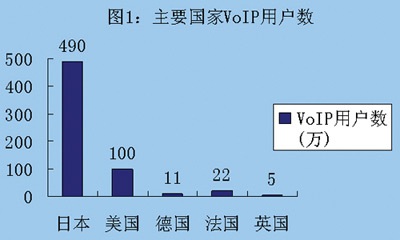 目前全球VoIP市場已經形成,明顯的市場劃分也已出現。截至2004年底,日本共擁有VoIP用戶490萬,美國100萬,德國11萬,法國22萬,英國5萬 (如圖1所示)。根據Insight Research的調查,全球VoIP市場收入將在2005年達到820億美元,在2007年達到1965億美元,其中大部分增長是由商業(yè)用戶驅動的。