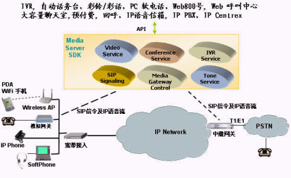 該公司的IP媒體服務(wù)器 (IP Media Server SDK)是一個(gè)具有IP多媒體處理能力和SIP呼叫功能的開放平臺(tái)。它主要提供給各增值業(yè)務(wù)開發(fā)商、軟交換廠商、軟件開發(fā)商以及具有開發(fā)能力的系統(tǒng)集成商;谠撈脚_(tái),這些廠商可以迅速地、低成本地開發(fā)出各種各樣的基于IP的增值業(yè)務(wù)如下圖所示:
