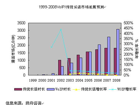 2000年以來,IP長話憑借明顯的資費(fèi)優(yōu)勢,對(duì)傳統(tǒng)長話形成了有力的競爭,在通話量上已趕超了傳統(tǒng)長話。也正是由于IP長話的低資費(fèi),在其通話量大幅度增加的同時(shí),也導(dǎo)致了國內(nèi)長話網(wǎng)總體收入的下降,長途電話IP化的趨勢十分明顯?傮w而言,中國VoIP市場仍蘊(yùn)藏著非常大的潛力,按照3G和NGN的部署速度,