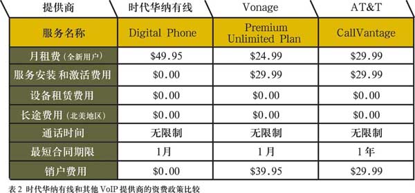 聲稱(chēng)其1/3的有線(xiàn)電視用戶(hù)和一半以上的寬帶用戶(hù)訂購(gòu)了其提供的VoIP服務(wù)。對(duì)于時(shí)代華納有線(xiàn)的全新VoIP用戶(hù)來(lái)說(shuō),開(kāi)通并使用“數(shù)字電話(huà)”的費(fèi)用為每月49.95美元,那些時(shí)代華納有線(xiàn)的寬帶用戶(hù)只需44.95美元,如果用戶(hù)同時(shí)使用有線(xiàn)電視和寬帶,那么只需要39.95美元就可以了,時(shí)代華納有線(xiàn)為所有的服務(wù)(視頻、語(yǔ)音和數(shù)據(jù)接入)提供每月統(tǒng)一的賬單。此外用戶(hù)使用“數(shù)字電話(huà)”不需要簽訂長(zhǎng)期合同,并享有30天的試用期,相對(duì)于其競(jìng)爭(zhēng)對(duì)手來(lái)說(shuō)賦予了用戶(hù)更多的自由。