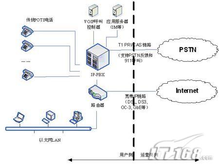 圖2顯示了從傳統(tǒng)的中央交換機業(yè)務向基于IP的中央交換機業(yè)務轉(zhuǎn)換的一個具有可行性的解決方案體系結構,這個方案盡量使得用戶側(cè)客戶端對于基礎設施的投資最小化,而運營商對此的投資回報則會相對較多(Internet服務提供商,ISP相對較少,而電信運營商更多)。更具體來講,部署成本取決于設備接口和服務的需求、部署的范圍、備的使用年限、現(xiàn)有可用的IP網(wǎng)絡基礎設施等等,因此每個具體的解決方案需要單獨地核算成本。