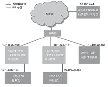 8960 ,將GRPS實(shí)驗(yàn)室應(yīng)用測試集用作媒介,將 i.250 2.5G 開發(fā)板卡 (ADS板卡)連接到互聯(lián)網(wǎng)。ADS板卡在接通電源時(shí),注冊登錄到GPRS網(wǎng)絡(luò),測試集然后通過路由器連接到互聯(lián)網(wǎng)。測試集充當(dāng)連接到GPRS的DUT的橋梁,讓它們接入互聯(lián)網(wǎng)。一旦GPRS上下文激活,測試集將為ADS分配一個(gè)固定IP地址。此外,在PC上運(yùn)行的代理服務(wù)器也連接到同一個(gè)路由器。通過這種安排,確保三個(gè)實(shí)體都能在同一網(wǎng)段內(nèi)運(yùn)行。這樣就能對同一個(gè)網(wǎng)段內(nèi)的分組流量進(jìn)行監(jiān)控,用于開發(fā)目的。