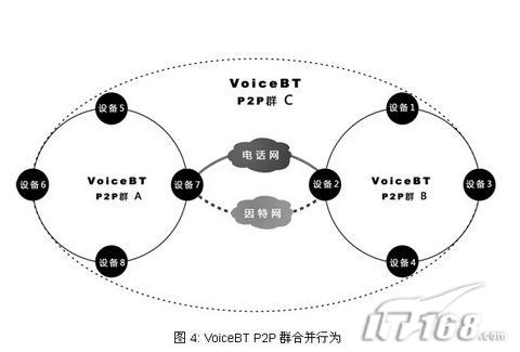 純P2P是采用分布式信息共享技術(shù)實現(xiàn)的無服務(wù)器網(wǎng)絡(luò)體系結(jié)構(gòu),VoiceBT P2P群是一個采用純P2P技術(shù)并由所有callfreee設(shè)備自發(fā)組成的智能P2P網(wǎng)絡(luò),電話線交互IP定位信息技術(shù)不但可以使網(wǎng)絡(luò)不需要服務(wù)器而且能夠極大的加快網(wǎng)絡(luò)收斂速度和增強網(wǎng)絡(luò)穩(wěn)定性。VoiceBT P2P群基本行為分為合并和查詢兩種。本文用圖例的方式簡要的介紹一下這兩種行為。