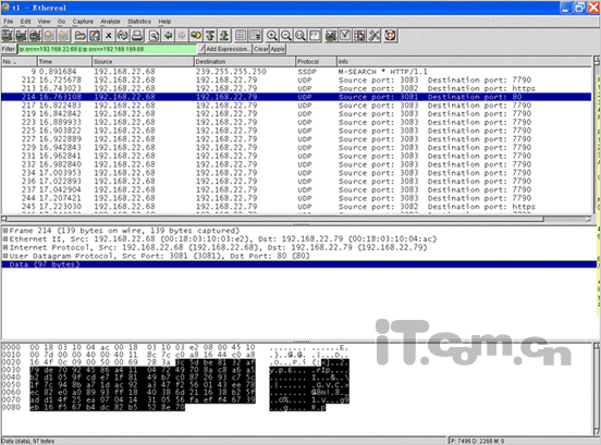 我們?cè)诰钟蚓W(wǎng)中放入兩臺(tái)callfreee設(shè)備,同時(shí)接入一臺(tái)PC運(yùn)行ethereal軟件進(jìn)行抓包來(lái)分析協(xié)議。