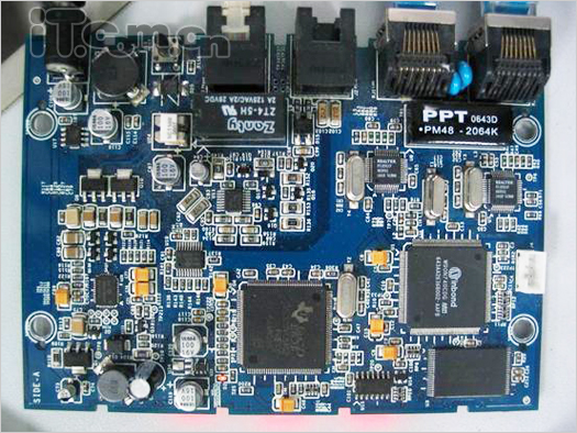 設(shè)備由幾個(gè)螺絲固定,上下兩個(gè)外殼由8個(gè)卡口卡住,卡后連接非常緊密,在沒(méi)有特殊器件的情況下不用暴力無(wú)法打開(kāi)。拆開(kāi)后,就可以看到下圖的PCB板子,上面密密麻麻的排滿的器件,大體上和通用VoIP適配器方案差不多,但是有些地方不同。