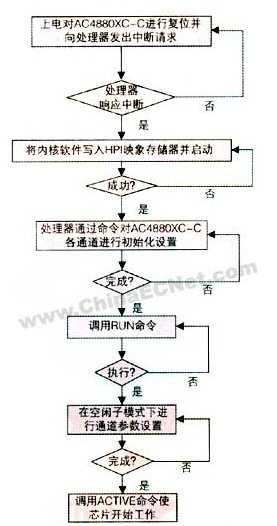 首先通過(guò)處理器對(duì)codec和cpld進(jìn)行配置,并調(diào)用audiocodes 公司提供的初始化內(nèi)核程序?qū)c4880xc-c進(jìn)行復(fù)位初始化。復(fù)位成功后,寫(xiě)入內(nèi)核程序,然后寫(xiě)入工作程序,最后再將這些程序通過(guò)ac4880xc-c的hpi接口寫(xiě)入到ac4880xc-c,芯片即開(kāi)始工作。