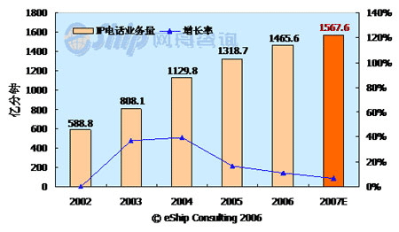從圖中可以看出,國(guó)內(nèi)IP電話(huà)市場(chǎng)近年呈現(xiàn)出快速增長(zhǎng)趨勢(shì),2002-2007年年均增長(zhǎng)率為20.7%。預(yù)計(jì)2007年IP電話(huà)的通話(huà)時(shí)長(zhǎng)將達(dá)到1567.6億分鐘,同比增長(zhǎng)7%。但從2005年開(kāi)始,IP電話(huà)的增長(zhǎng)率呈下降趨勢(shì),這主要是受管制限制和移動(dòng)長(zhǎng)途的替代作用所致。