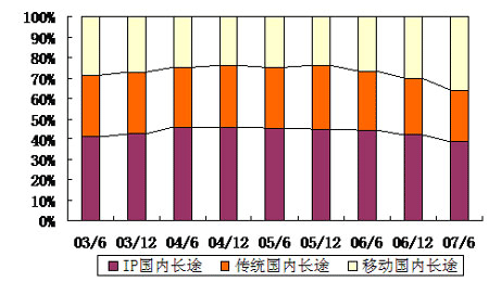 從圖中可以看出,IP電話(huà)的相對(duì)快速增長(zhǎng)在一定程度上對(duì)傳統(tǒng)長(zhǎng)途電話(huà)形成了替代作用,但近年來(lái)自于移動(dòng)長(zhǎng)途的替代作用更明顯。從占比上來(lái)看,2007年上半年,IP國(guó)內(nèi)長(zhǎng)途電話(huà)占全部國(guó)內(nèi)長(zhǎng)途通話(huà)量38.3%,超過(guò)移動(dòng)長(zhǎng)途電話(huà)的35.9%和傳統(tǒng)長(zhǎng)途電話(huà)的25.8%,仍然是長(zhǎng)途電話(huà)的主流。