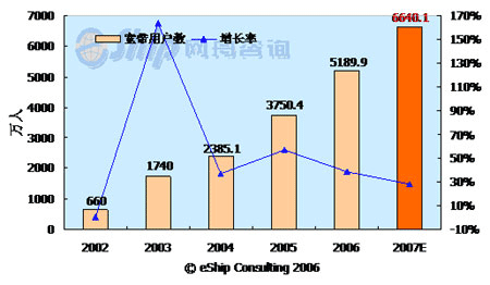 從圖中可以看出,中國(guó)的寬帶用戶(hù)數(shù)保持了快速的發(fā)展勢(shì)頭,從2002-2007年年均增長(zhǎng)率為58.7%,至2007年,國(guó)內(nèi)的寬帶用戶(hù)數(shù)將達(dá)到6640.1萬(wàn)。