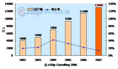 從圖中可以看出,國(guó)內(nèi)即時(shí)通訊用戶(hù)數(shù)保持了較快的發(fā)展速度,從2002-2006年年均增長(zhǎng)率為26.6%,到2007年國(guó)內(nèi)即時(shí)通訊用戶(hù)數(shù)將達(dá)到1.3億。