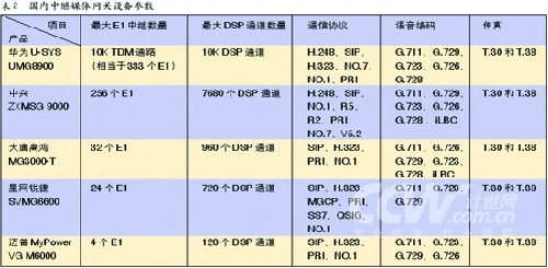 結合表2中的數據,可以看出國內中繼媒體網關設備制造商的定位非常類似于軟交換設備的市場定位,從設備支持的最大E1數和最大DSP通道數來看,華為和中興的中繼媒體網關主要是面向運營商客戶,不難發(fā)現網關支持的協議也最為豐富,能夠滿足和運營商不同協議體系網絡互通的需要。而大唐高鴻、星網銳捷和邁普的中繼媒體網關主要定位在企業(yè)行業(yè)客戶。