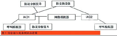 我國通信行業(yè)國家標準《基于軟交換的綜合接入設備測試方法》中明確了IAD設備九個大項的測試,分別是基本功能測試、協議測試、接口測試、話音業(yè)務測試、數據業(yè)務測試、性能測試、OAM測試、硬件項目測試和環(huán)境測試。按照圖4所示的測試拓撲圖進行連接,就可以按照測試方法中的測項要求,逐一得出測試結果。