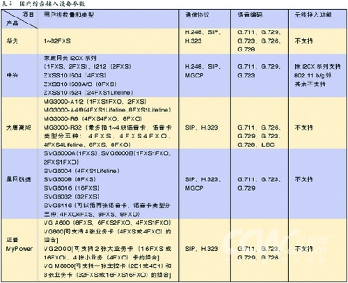 大唐高鴻的IAD產品和中繼媒體網關一樣,均支持iLBC語音編碼,這對于自身設備的組網帶來整體語音質量的提升有很大的幫助。中興的家庭網關I20X系列設備支持802.11 b/g無線接入功能,成為國內廠家中VoIP無線化技術的一個領先者。另外,邁普、大唐高鴻和星網銳捷的IAD都有一個特點,就是將語音接入功能模塊化,這一設計思想使最終用戶能夠根據實際需要,通過增減語音板卡就可以得到自己需要的用戶線數和類型的配置。