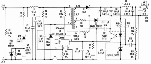 整個(gè)電源效率為78%,這樣1個(gè)簡(jiǎn)單的反激電源能提供3.3V(2A)。對(duì)大多數(shù)應(yīng)用來(lái)講,低成本和簡(jiǎn)單化是最重要的特性。假若采用同步整流正激轉(zhuǎn)換器拓?fù)浜途哂休^低通導(dǎo)功耗、較高功率的器件DPA424G,則電路效率可增加5%~10%。