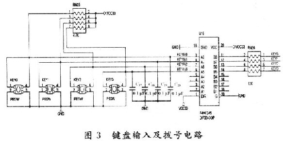 為實(shí)現(xiàn)IP電話與普通電話的通用性,該終端加入鍵盤模塊,按鍵開(kāi)關(guān)KEY0~KEY9,KEY_X,KEY_Y,KEY_ON,KEY_OFF(其中,除KEY_ON和KEY_OFF是鎖閉式按鍵外,其余均為非鎖閉式按鍵)采用行列掃描式接法,加入了74HC245總線收發(fā)器作為緩沖器,電路如圖3所示(由于按鍵過(guò)多,圖中僅給出KEY0~KEY3電路)。