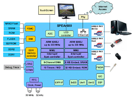 SPEAr600 是具有雙ARM926EJ-S核的嵌入式MPU, 性能高達733 DMIPS,支持靈活的存儲器,有功能強大的連接特性和可編程的LCD接口. ARM926EJ-S內(nèi)核的工作頻率高達333MHz,其中的MMU支持虛擬的存儲器管理,是系統(tǒng)能和Linux操作系統(tǒng)兼容.主要用在需要大量計算的應用中如企業(yè)VoIP設備,可編邏輯控制器(PLC),醫(yī)療實驗室/診斷設備,無線接入設備,家用電器等.本文介紹SPEAr600主要特性,方框圖, 典型系統(tǒng)架構圖以及EVALSPEAR600評估板主要特性,電路圖和材料清單(BOM).