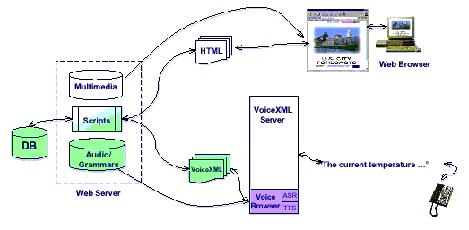 VoiceXml 1.0規(guī)范基于W3C的工業(yè)標(biāo)準(zhǔn)XML,為語(yǔ)音和電話應(yīng)用的開發(fā)者,服務(wù)提供商和設(shè)備制造商提供了一個(gè)智能化的API。VoiceXml的標(biāo)準(zhǔn)將簡(jiǎn)化WEB上具有語(yǔ)音響音服務(wù)的個(gè)性化界面的創(chuàng)建,使人們能夠通過語(yǔ)音和電話訪問網(wǎng)站上的信息和服務(wù),同時(shí)與CGI(PERL,PHP,C,JAVA SERVLET等)的腳本結(jié)合在一起來檢索后臺(tái)數(shù)據(jù)庫(kù),訪問企業(yè)內(nèi)部網(wǎng),從而最終將語(yǔ)音瀏覽器與微型瀏覽器融合在一起,實(shí)現(xiàn)計(jì)算機(jī)網(wǎng)絡(luò)與電話技術(shù)的完美結(jié)合。其具體的系統(tǒng)結(jié)構(gòu)如下: