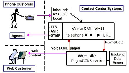 從圖中我們可以看出,同傳統(tǒng)的INTERNET網(wǎng)站相比,在不需要太大的改動(dòng)前提下,只要增加一個(gè)VoiceXml的服務(wù)器處理來自PSTN的應(yīng)用即可。在VoiceXml的服務(wù)器中,包含了VoiceXml的解釋器(VoiceXml解釋程序語(yǔ)境),VoiceXml自帶的瀏覽器,自動(dòng)語(yǔ)音識(shí)別(ASR)及文本到語(yǔ)音(TTS)的轉(zhuǎn)換設(shè)備。