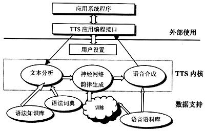 系統(tǒng)的構(gòu)成分為用戶編程接口和TTS內(nèi)核兩大部分。其中,內(nèi)核部分又可按照系統(tǒng)運(yùn)作的不同過(guò)程分為多個(gè)子模塊,包含了訓(xùn)練模塊、文本分析模塊、神經(jīng)網(wǎng)絡(luò)韻律生成模塊、語(yǔ)音合成模塊以及與語(yǔ)料庫(kù)之間的通信協(xié)議等。同時(shí),系統(tǒng)還考慮了不同類型用戶對(duì)TTS系統(tǒng)功能的需要,提供了豐富的編程接口。