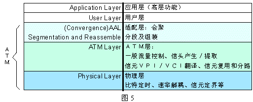 ATM層和OSI模型不完全一致,它主要處理物理層和數(shù)據(jù)鏈路層問題,其協(xié)議分層如下圖5所示,其中簡要地列出了各層的中英對照和相應(yīng)的功能。