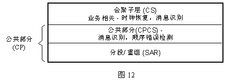 ATM適配層,是ATM核心(包括ATM層和物理層,與業(yè)務(wù)無關(guān))和高層間的接口(見圖5),它是為使ATM層能適應(yīng)不同業(yè)務(wù)類型而設(shè)置的,故ATM對各種業(yè)務(wù)承載能力集中體現(xiàn)在ATM適配層。ATM適配層又細(xì)分為若干子層。具體如下圖12。