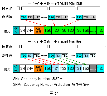 在同一個虛通道(VC)中,AAL1還支持一個或多個DS0(64Kbps)。當(dāng)虛通道中只有一個DS0話音時,可以使用無結(jié)構(gòu)數(shù)據(jù)格式(UDF:Unstructured Data Format)傳送,這是一種面向比特的技術(shù);當(dāng)有多個DS0同時傳送時,必須使用結(jié)構(gòu)化數(shù)據(jù)格式(SDF:Structured Data Format),此時各DS0數(shù)據(jù)流按字節(jié)依次傳送,即是面向字節(jié)的。這兩種格式的區(qū)別如下圖13所示。其中AAL1指針用于指示多DS0時,第一個DS0字節(jié)位置,以便定時。利用AAL1可以實現(xiàn)ATM對STM(TDM)信號的傳送,見圖14。