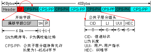 圖中清楚地顯示了一個ATM信元中傳輸多路話音的情形。其中的各CPS-PH+CPS-PP相當(dāng)于該ATM信元所在VC中的微通道(Mini-Channel),這就允許選擇最佳的分組尺寸以獲得最小時延,同時允許多個活動AAL2微通道有效地復(fù)用在一個VC中,從而提高帶寬效率。