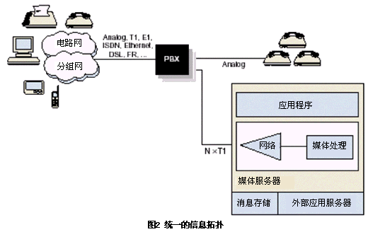 圖2是有前提的典型統(tǒng)一消息拓撲圖。這個例子中媒體服務器管理消息的存儲和提取,這些消息包括語音、傳真、數(shù)據(jù)或視頻。它可以訪問不同媒體文件以及必要的控制規(guī)則以實現(xiàn)各類媒體業(yè)務?梢栽诒镜氐拿襟w服務器上也可以在遠程的集中存儲系統(tǒng)上進行存儲。在這種情況下,能提供語音和傳真資源的統(tǒng)一的消息系統(tǒng)通常和email系統(tǒng)比如微軟的Microsoft