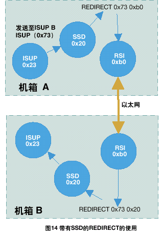 運行在信令卡上的協(xié)議模塊,接收端(對方)的REDIRECT語句應該通過ssd或ssds驅(qū)動(通常情況下module_id為0x20)來對訊息進行重定向,如圖14所示。
