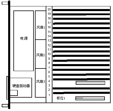 DSC210機箱包括具有20個插槽的無源主板,同時還有一個電源模塊、軟盤驅動器、風扇電源分配器、錯誤檢測模塊和一個前面板顯示卡。