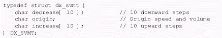 。。速度/音量調(diào)節(jié)表(DX_SVMT)數(shù)據(jù)結(jié)構(gòu)有21個(gè)代表不同級(jí)別的速度和音量的條目,用于指定信道的速度或者音量調(diào)節(jié)的變化率。這些值可以設(shè)置或者用dx_setsvmt()和dx_getsvmt()從表中取值。