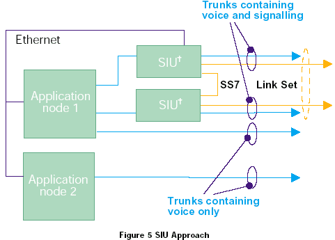 SIU通過(guò)從媒介處理中使用以太網(wǎng)分離SS7接口來(lái)處理容錯(cuò)的問(wèn)題,兩個(gè)SIU作為一個(gè)節(jié)點(diǎn)編碼進(jìn)行容錯(cuò),如圖5所示,通過(guò)分離SS7接口,SIU也允許系統(tǒng)最多可以由32個(gè)處理語(yǔ)音電路(媒介)的應(yīng)用節(jié)點(diǎn)組成。