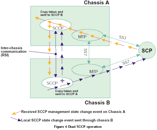 一個(gè)雙ISUP/TUP系統(tǒng)通過(guò)激活每個(gè)機(jī)箱中的一半電路協(xié)議狀態(tài)機(jī)進(jìn)行工作。每個(gè)ISUP/TUP層通過(guò)本地MTP3發(fā)送所有的傳送業(yè)務(wù)。本地MTP3采用與相鄰SS7節(jié)點(diǎn)之間的本地鏈路進(jìn)行傳輸,如果該鏈路發(fā)生故障,采用機(jī)箱之間的SS7連接。