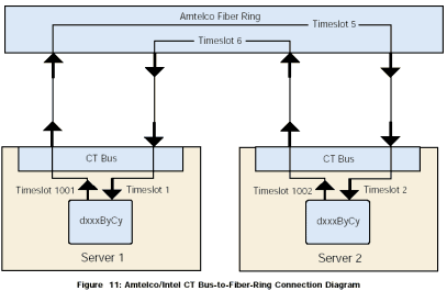 為了能夠共享時隙,將本地服務(wù)器上的CT總線連接到Amtelco光纖環(huán)路,然后從光纖環(huán)路連接到另外一個服務(wù)器的本地CT總線。圖11是一個簡單圖示,顯示了一個服務(wù)器1上的中間設(shè)備(dxxxBxCx)到另外一個服務(wù)器2上的中間設(shè)備(dxxxBxCx)的連接。